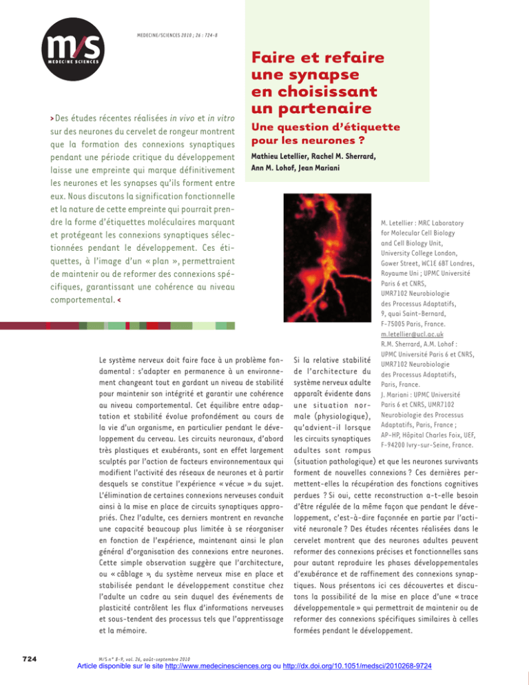 et de spécificité dans l’organisation des circuits synaptiques, laquelle